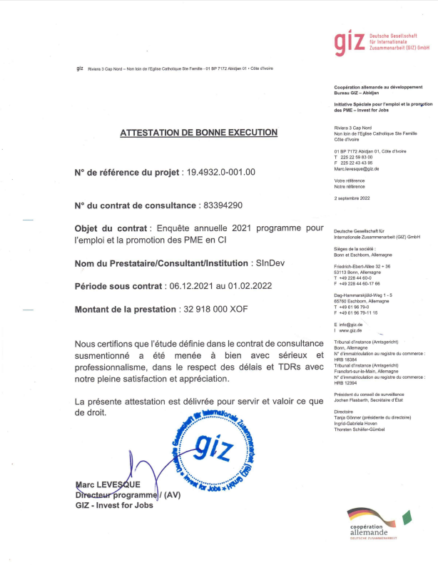 Stat’Innov Developpement, en abrégé (SInDev), est une société à responsabilité limitée (SARL), spécialisée dans la réalisation d’études socio-économiques et le renforcement des capacités dans les domaines des études de marché, de la gestion des projets et de la mise en place et le suivi des dispositifs de collecte d’informations (données). SInDev fournit des informations pertinentes à la prise de décision. Grâce à son large réseau d’intervenants couvrant diverses expertises dans différentes régions du globe, ses domaines d’intervention sont multiples : des études prospectives, de la conception et de l’évaluation de politiques et du développement communautaire, en particulier dans le secteur agricole et rural. Selon les besoins des clients, des études abordant d’autres thématiques peuvent être également menées.
